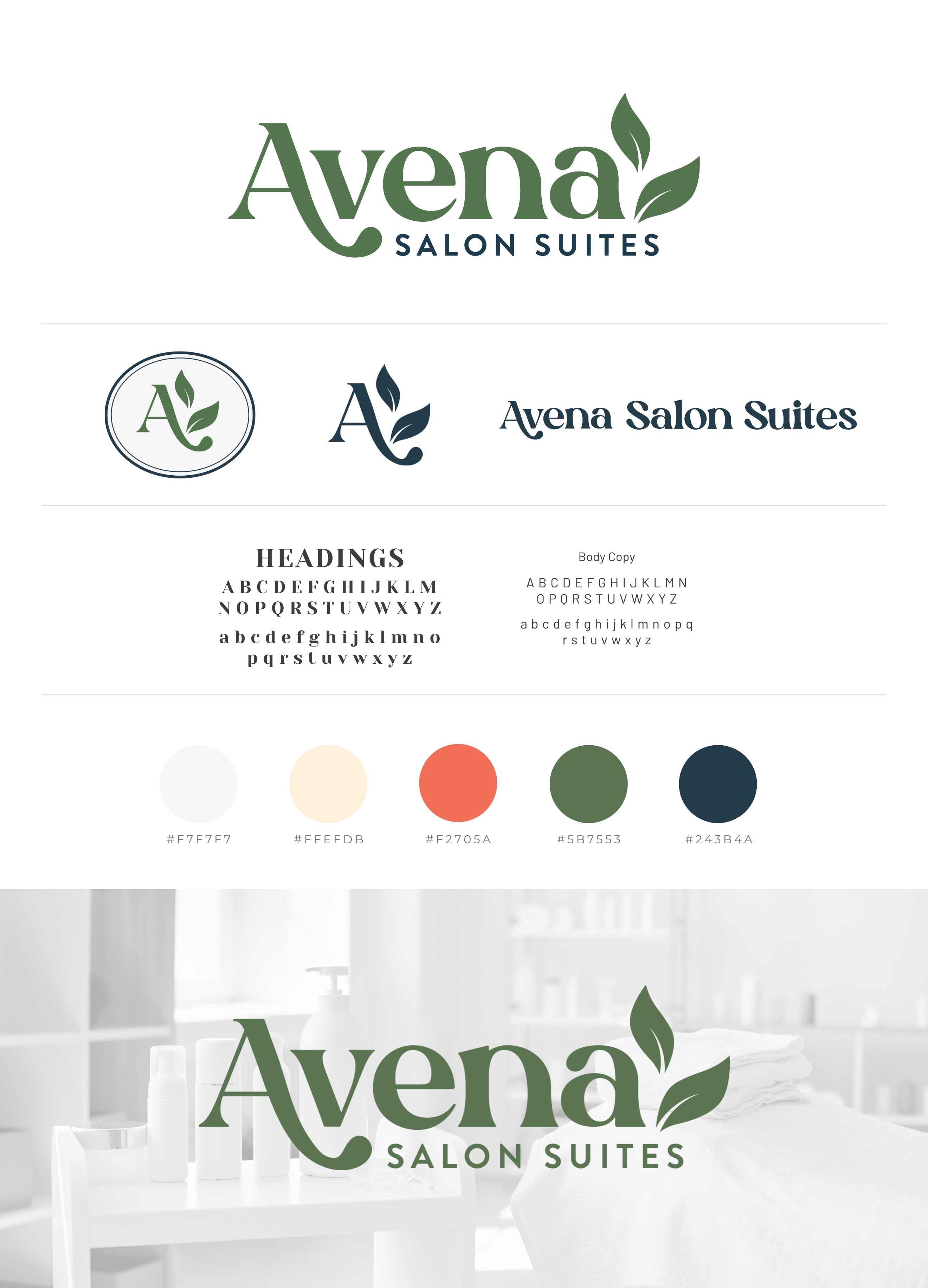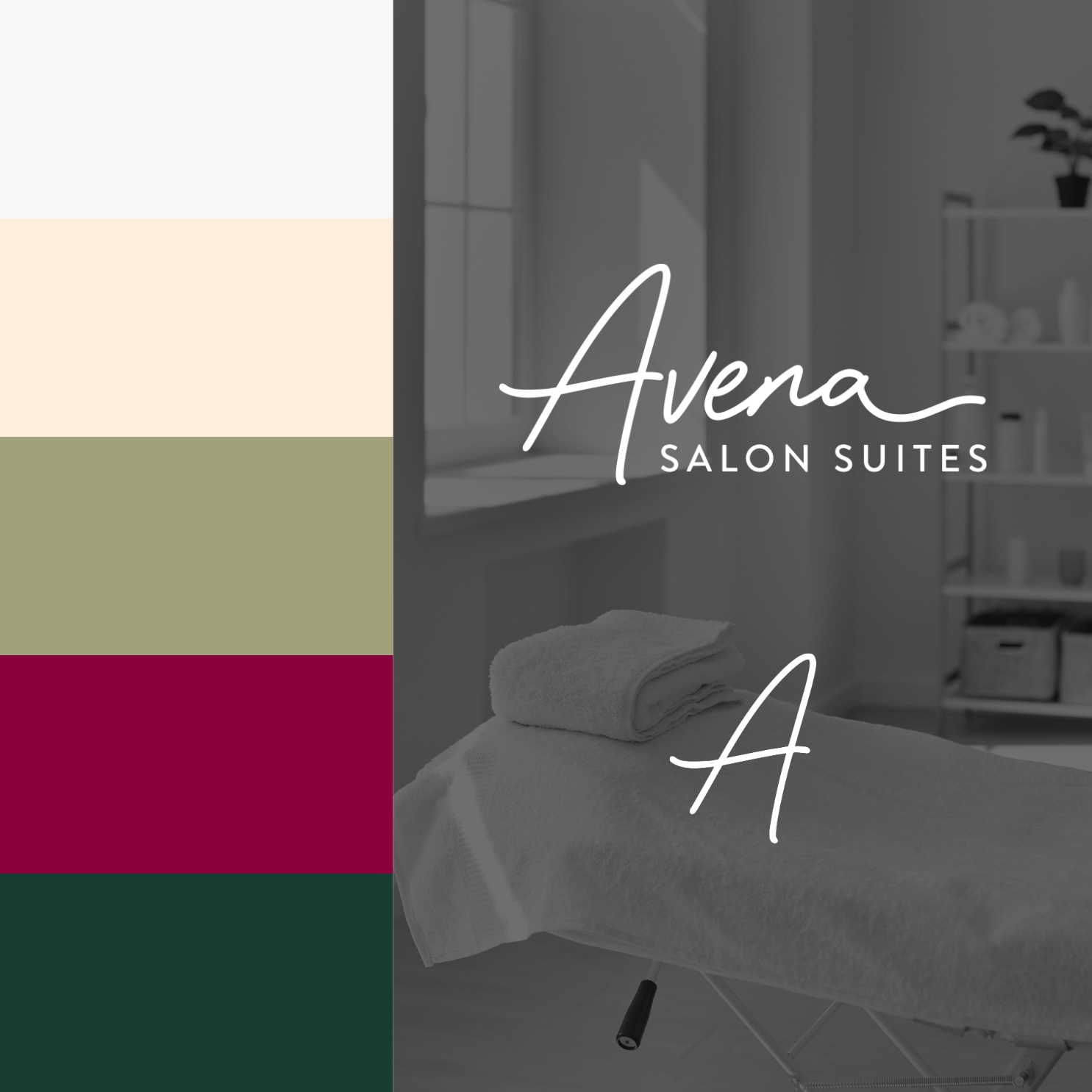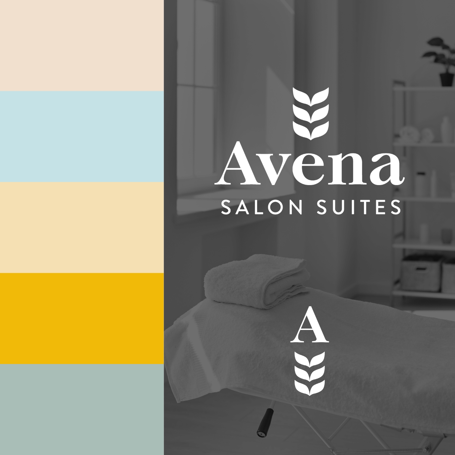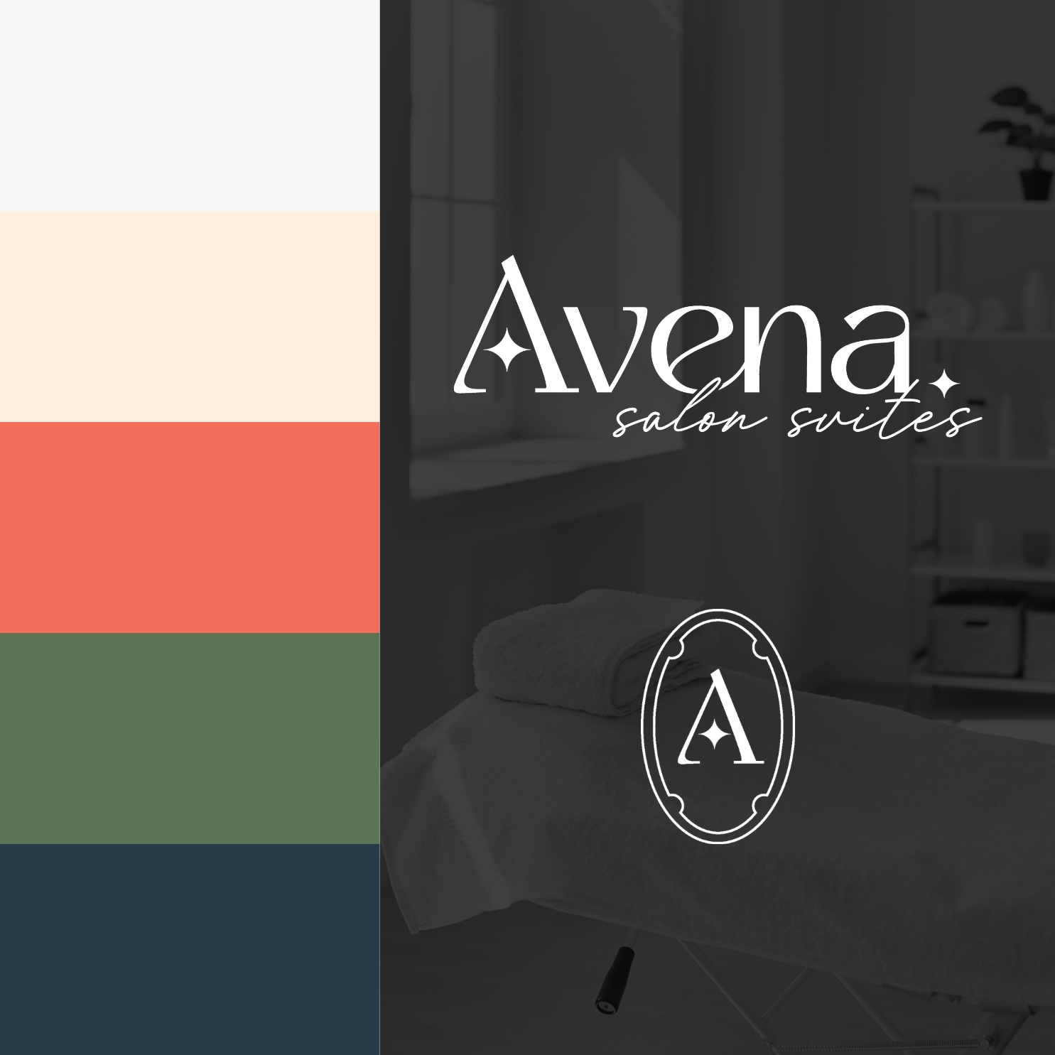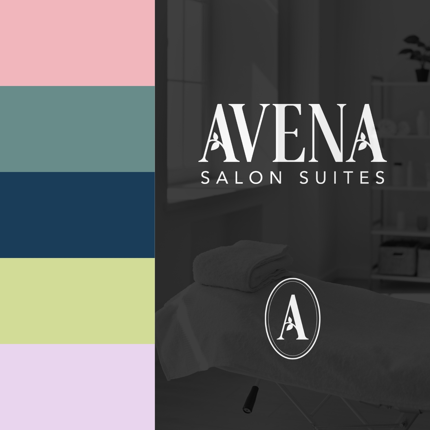 Brand identity and logo design for Avena Salon Suites, a Dallas-based salon suite brand.