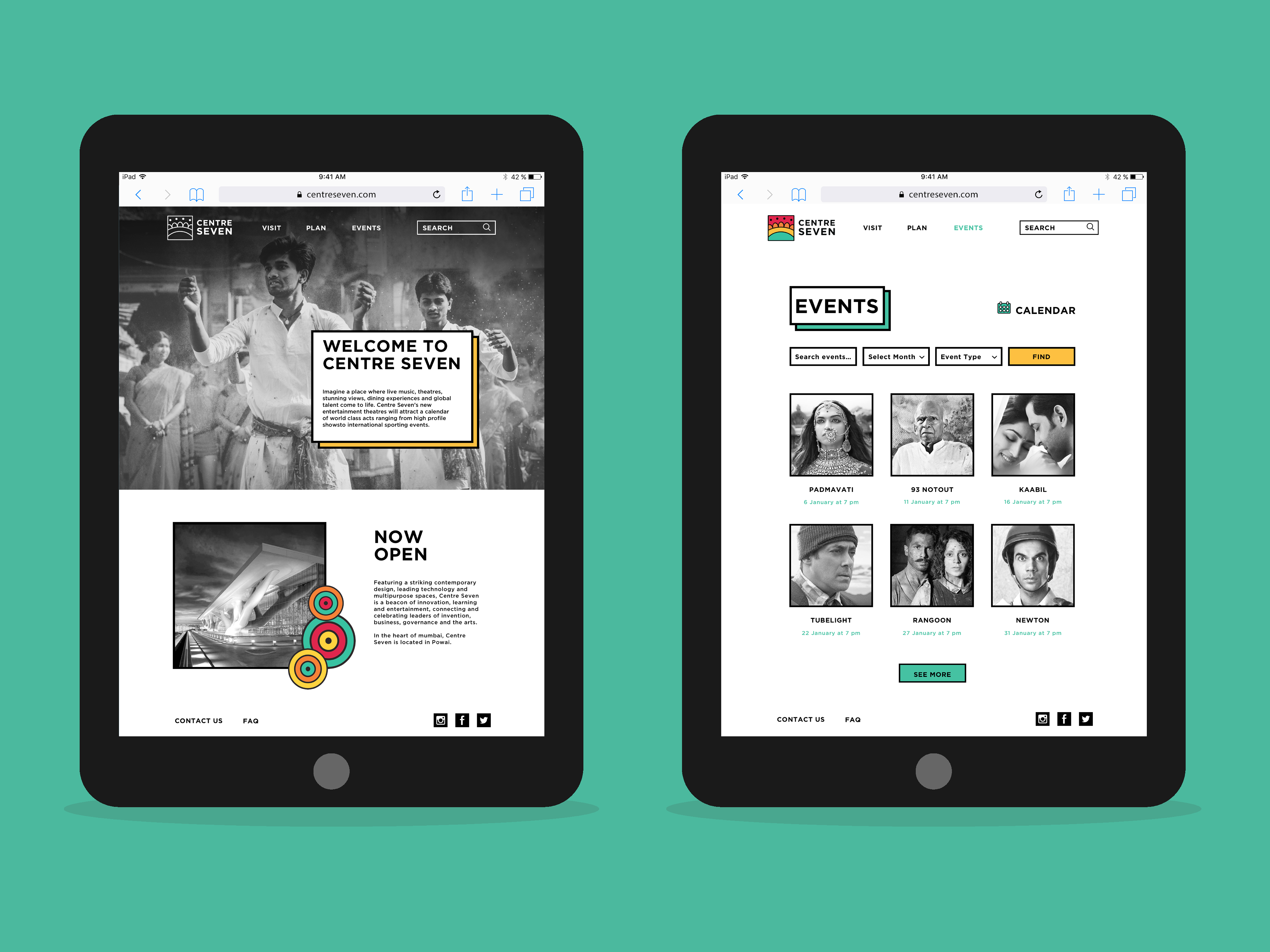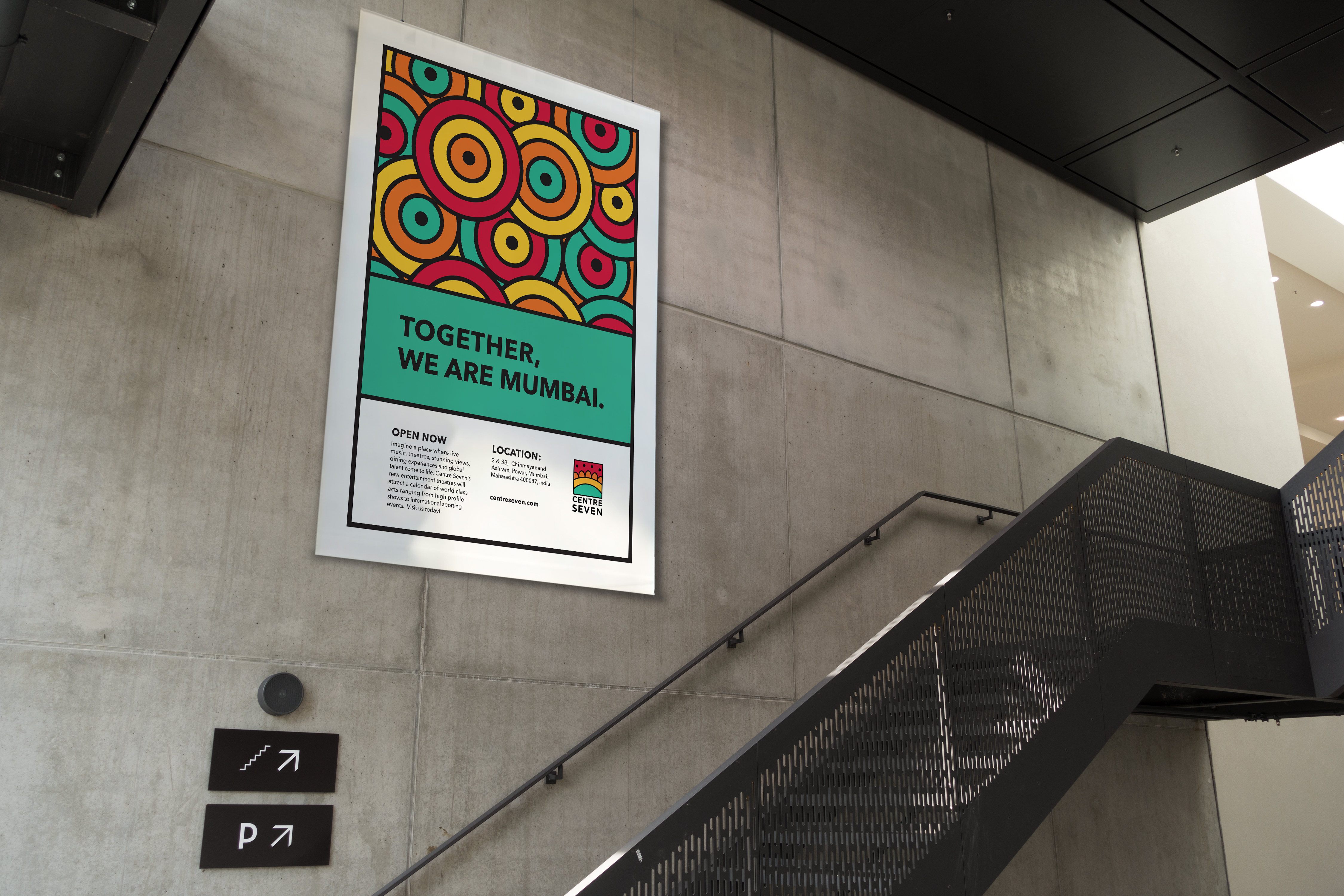 Solution: The design concept is centered around colorful Rangoli sand art. The name of the convention center, Centre 7 is based off the 7 islands that form Mumbai. Keywords used were: Connection, Melting Pot, and Opportunity. Sketch, Indesign, Illustrator, and Photoshop were used.