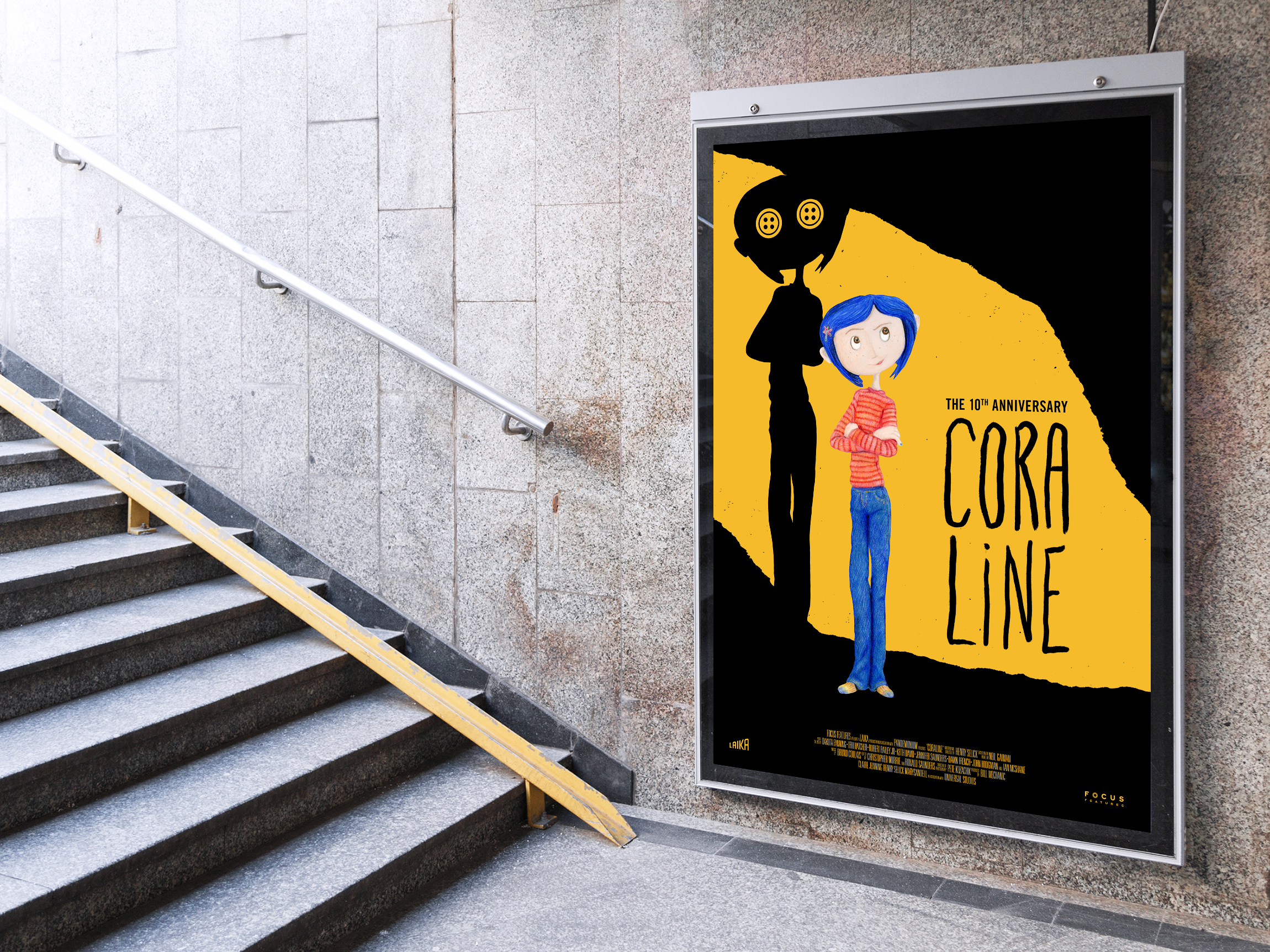 Handmade movie poster for Coraline. Created with colored pencils and cut paper. ​Handmade typography drawn with ink.