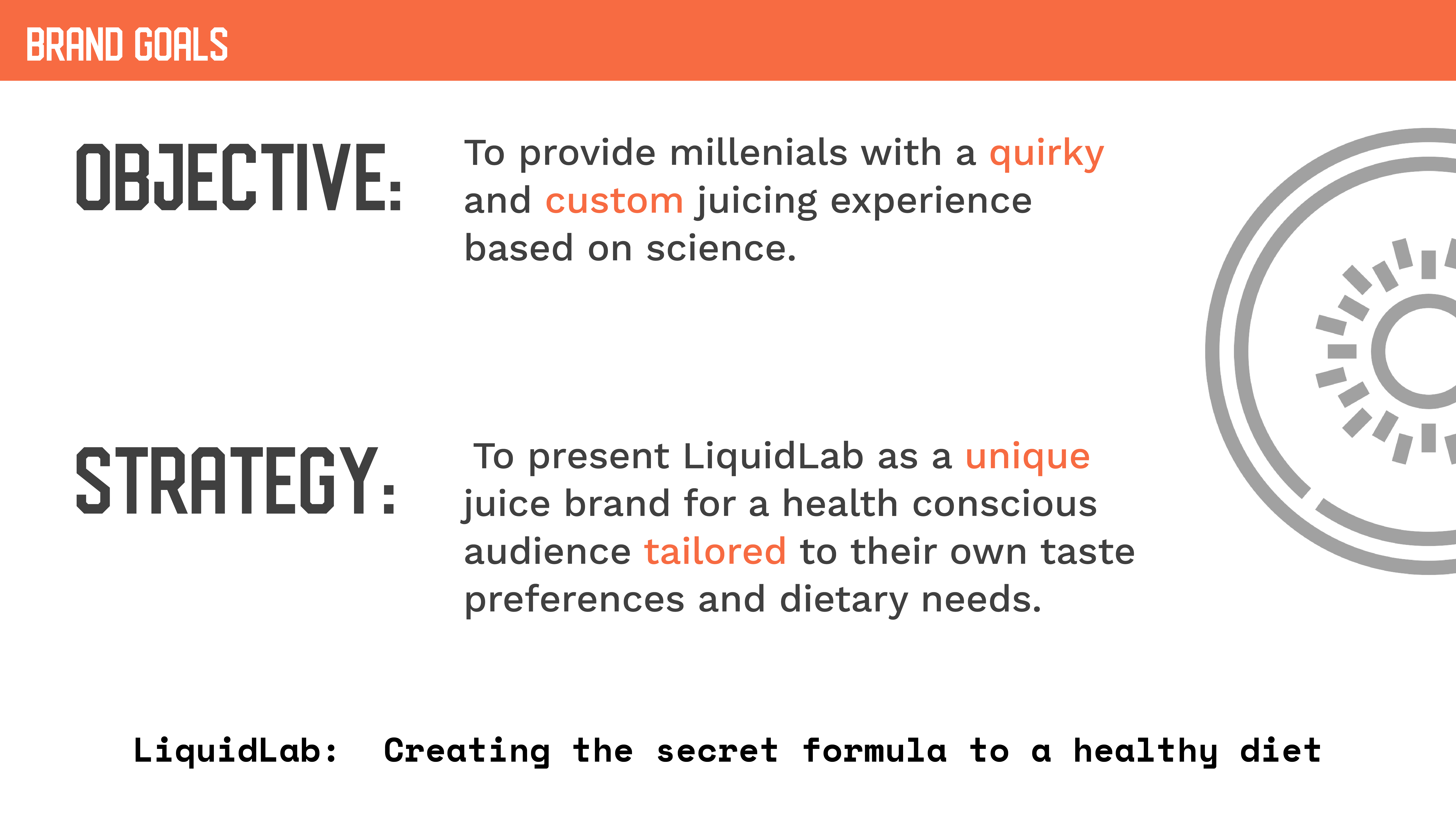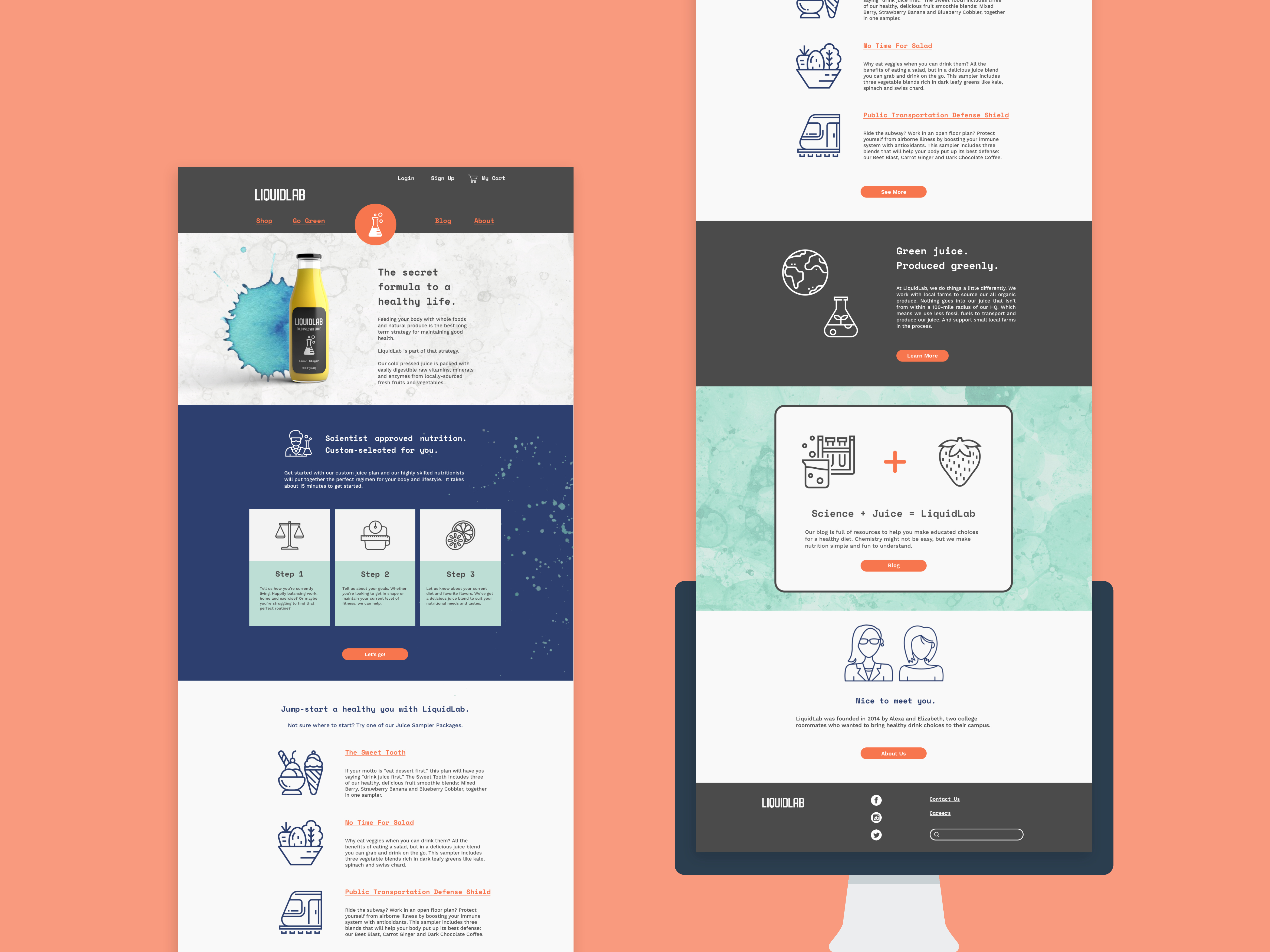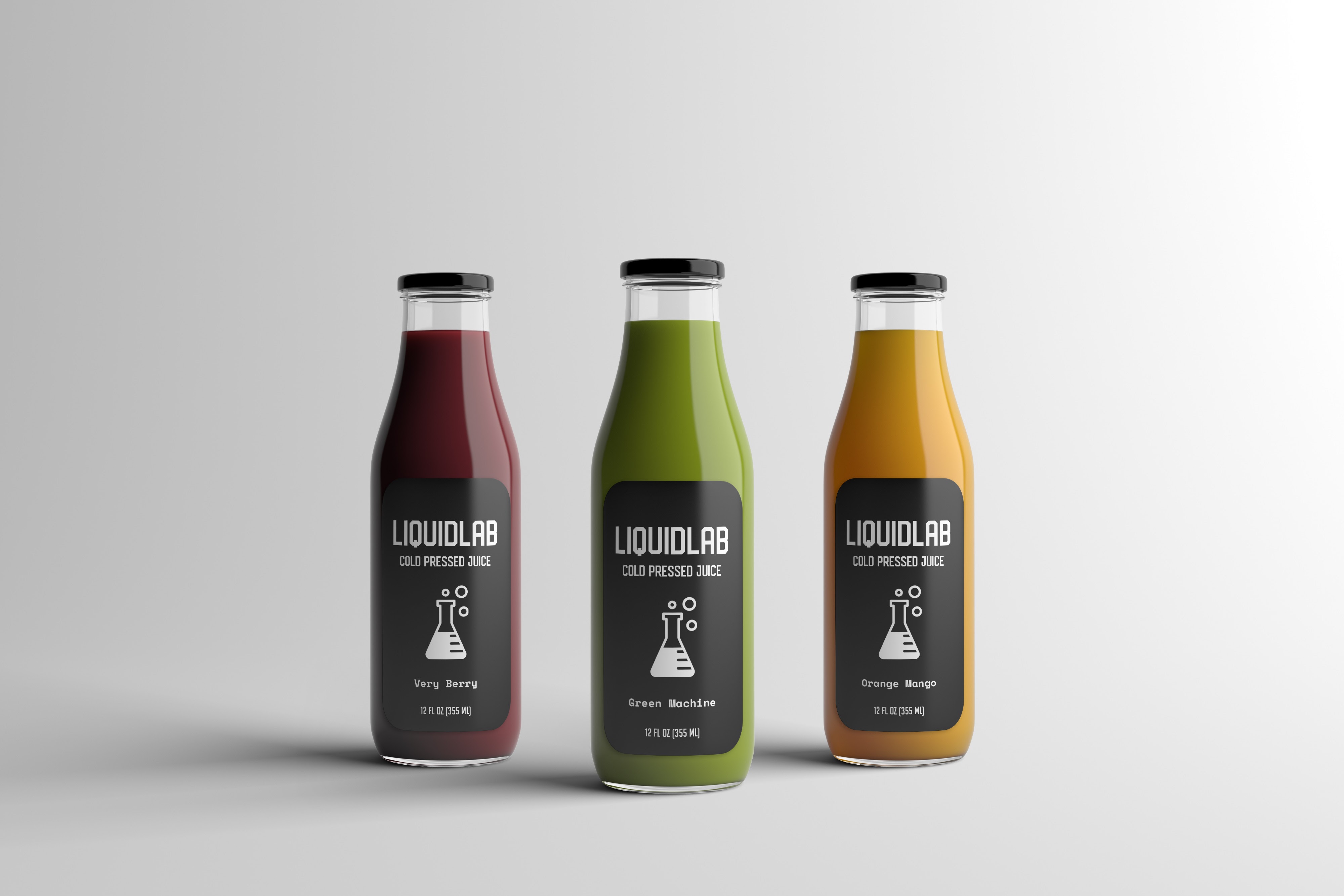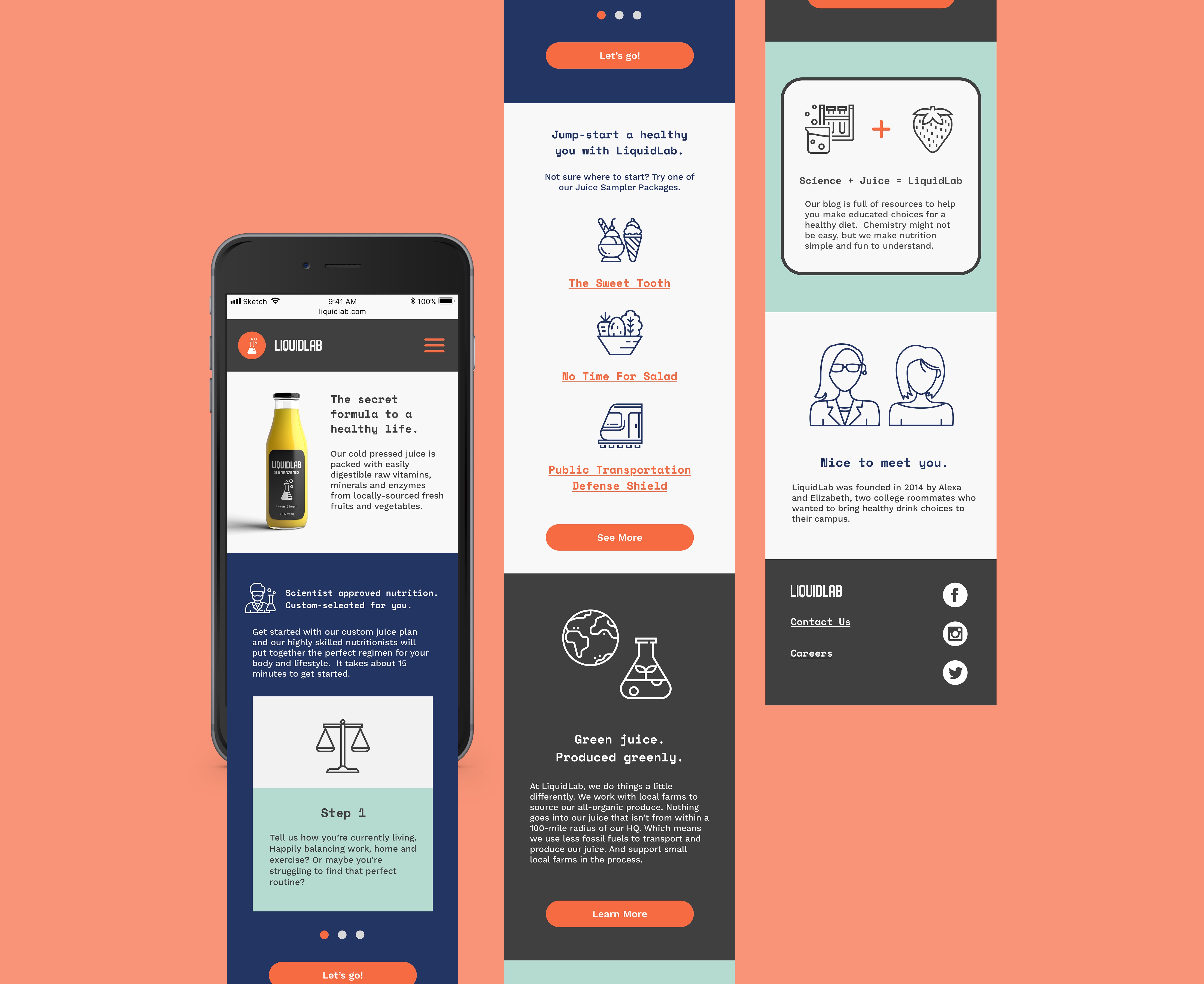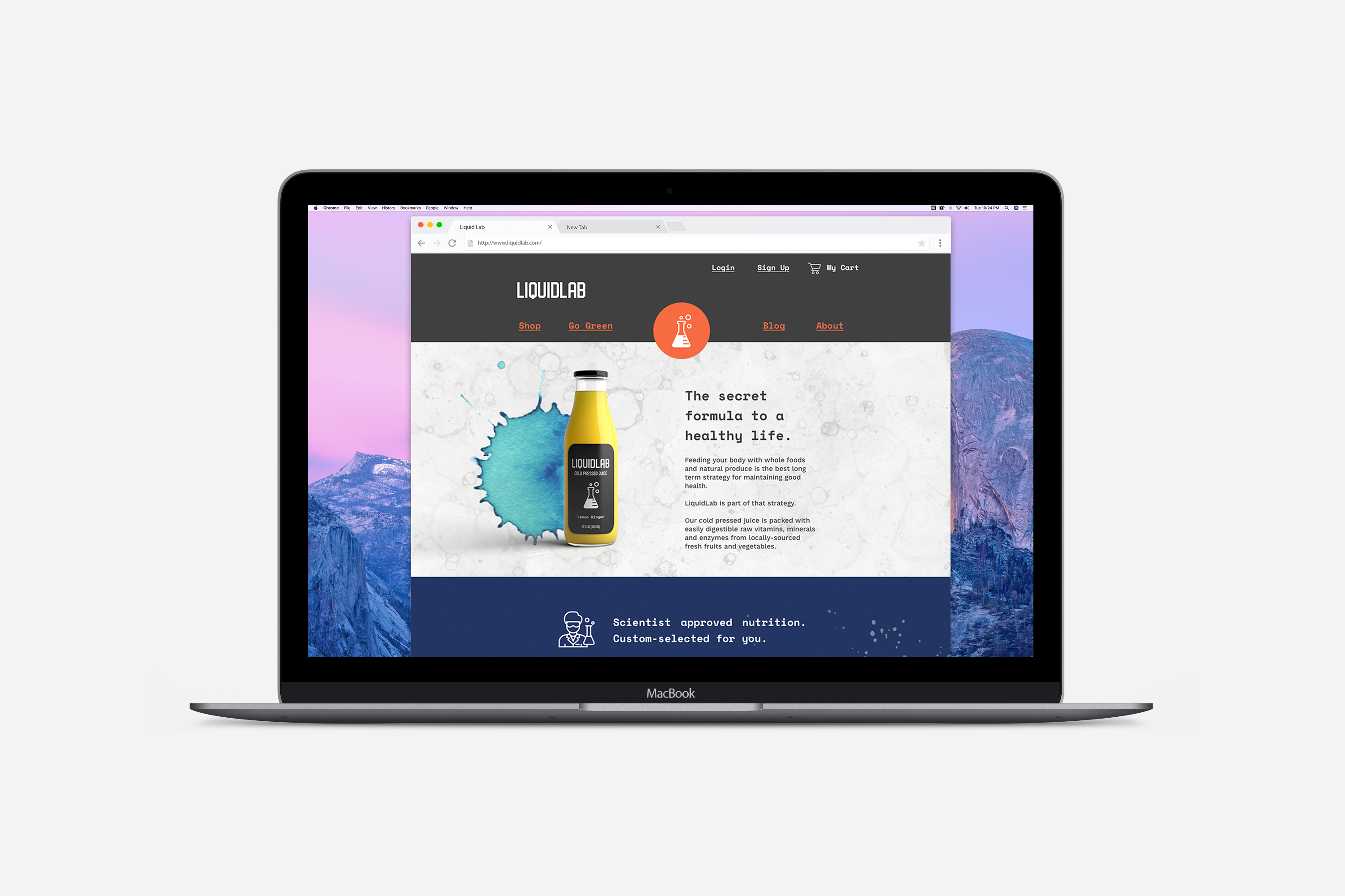 Solution: Present LiquidLab as a unique juice brand for a health conscious audience tailored to their own taste preferences and dietary needs. My keywords used were: Vitality, Created, and Quirky. I used Sketch to create the web design and Adobe Photoshop for the packaging design.