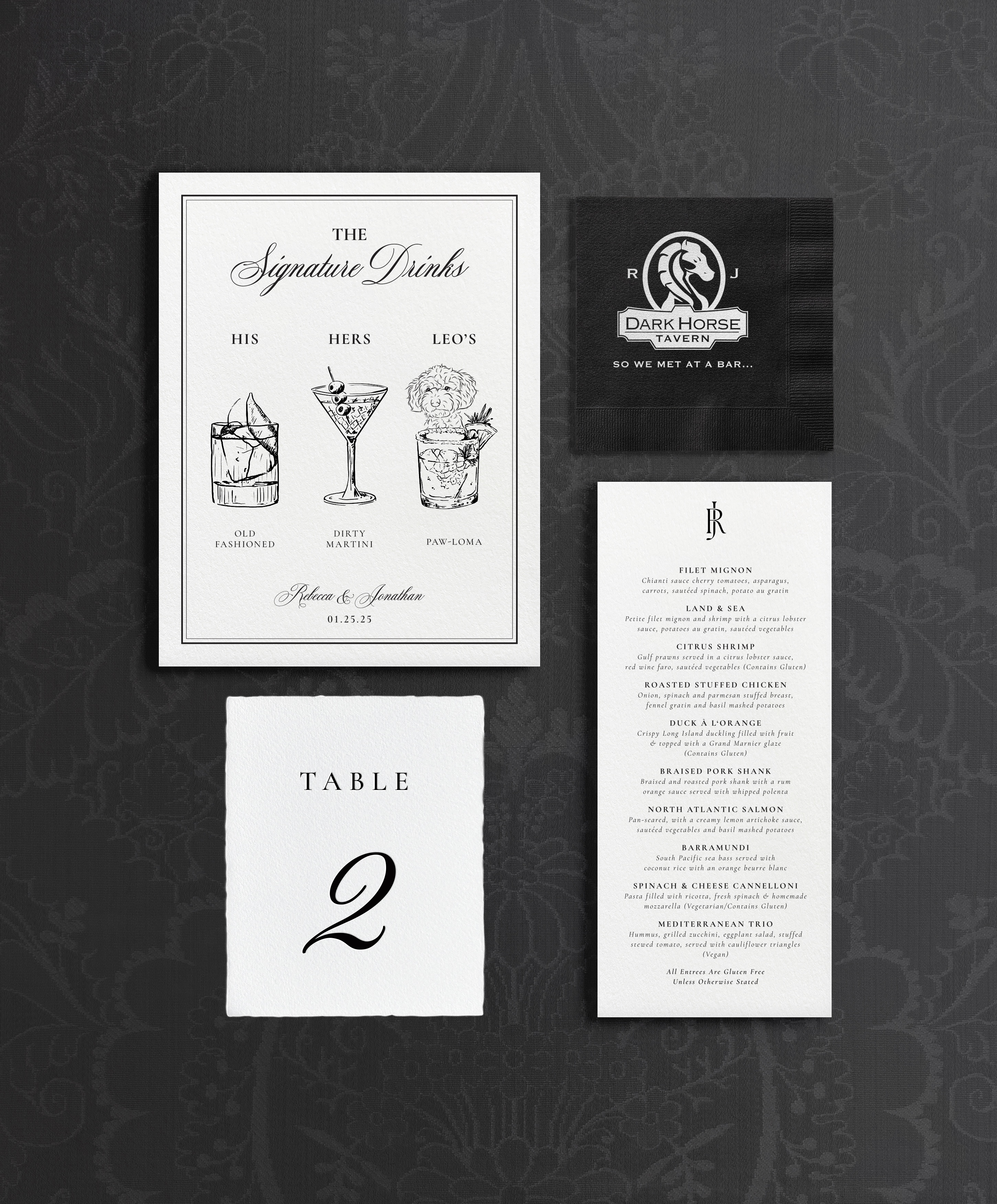 Together, we’ll explore your relationship, wedding theme, colors, and florals to craft invitations that are uniquely yours. Want to incorporate custom monograms or venue illustrations? I can make those a reality, too, and even carry your bespoke designs into day-of details like table numbers, programs, and signage for a cohesive look.